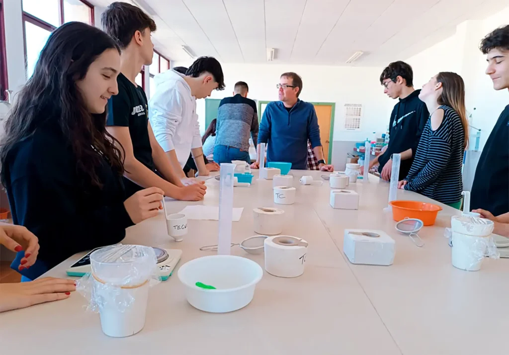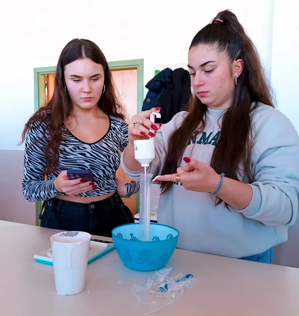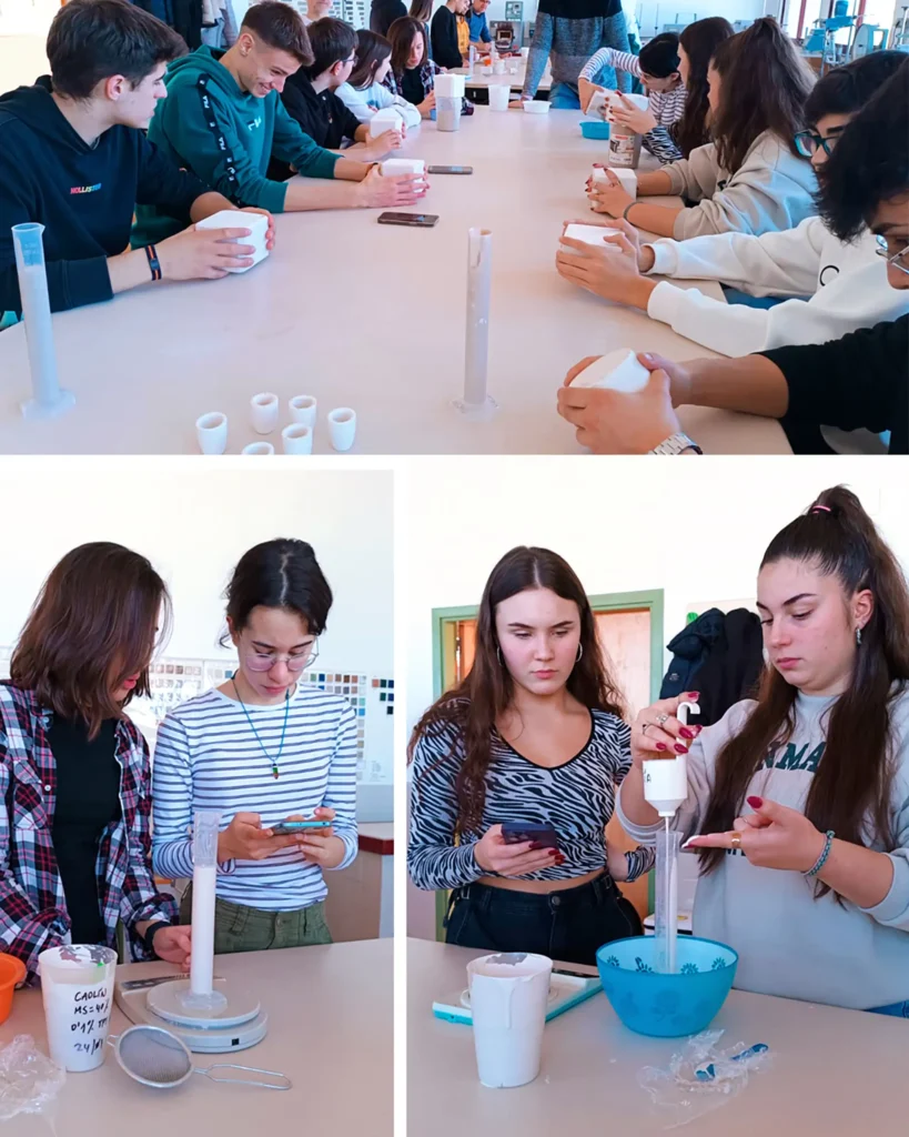 El alumnado con un perfil más técnico realiza una prueba de laboratorio a partir de barbotinas para calcular la densidad, viscosidad y otros factores. También realizan prensados a partir de polvo atomizado para la elaboración de baldosas cerámica y calcular finalmente la constante de plasticidad